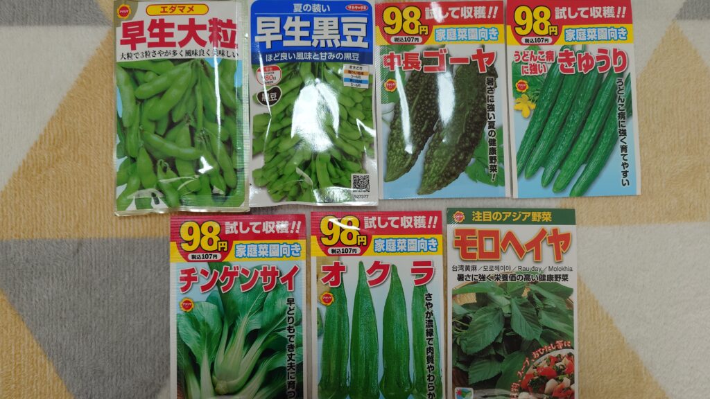 枝豆・黒豆・ゴーヤ・きゅうり・チンゲン菜・オクラ・モロヘイヤの7種類です‼️